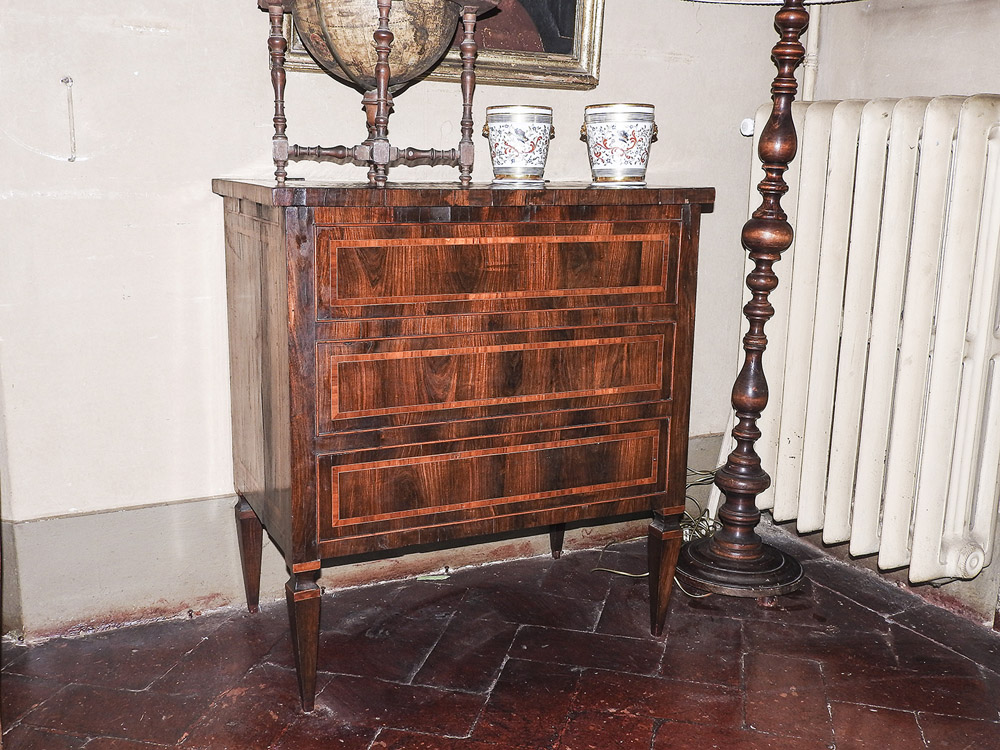 Piccolo stipo portalegna impiallacciato in piuma di noce fine del XVIII secolo intarsiato con filettature e cornici in legni di frutto, piano ad alzarsi, fronte a tre finti cassetti, gambe a faretra h cm 89,5x82x50