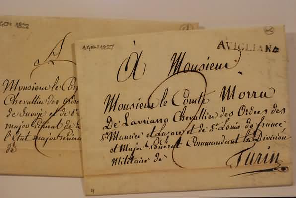 PREFILATELIA - 1822-27, AVIGLIANA, lineare su 2 fresche lettere tassate per Torino: uno in nero, uno in azzurro.(LETTERA)