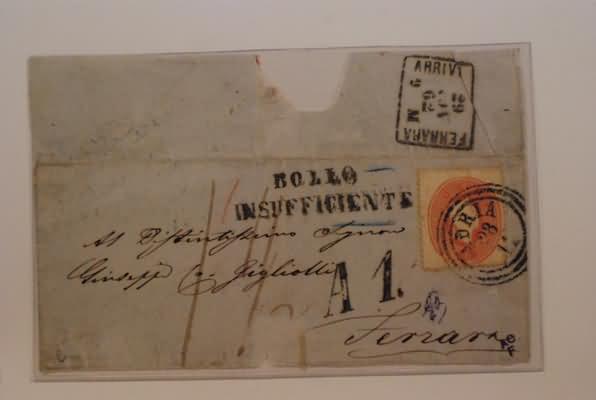 LOMBARDO VENETO - 1862, 5 soldi rosso (33)sul frontespizio di lettera, con bollo d'arrivo, da Adria per Ferrara, 28/11. A lato "Bollo insufficiente", "A.1" e tassazione "1 1/2".(FRAMMENTO)