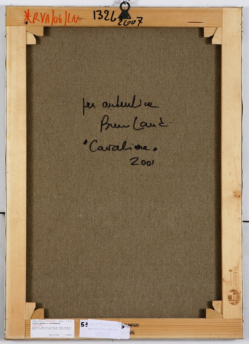 Firma in basso a sinistra. Opera archiviata presso l'Archivio Fotografico Generale delle Opere di Bruno Landi come da documentazione fotografica allegata riportante il relativo numero d'inventario. Al retro firma titolo e anno.