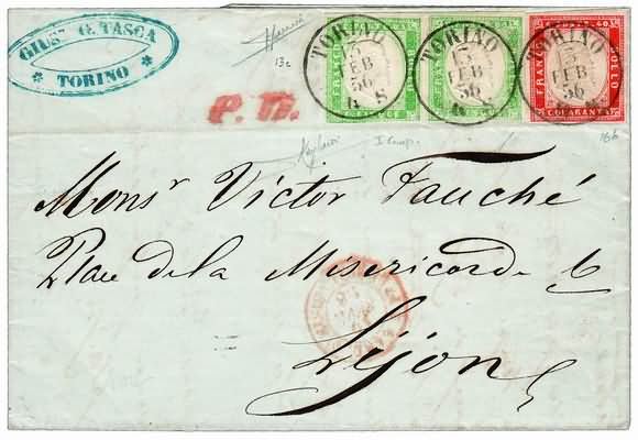 REGNO DI SARDEGNA - 1856, 5 c. verde pisello (13c) coppia orizzontale a filo in basso + 40 c. vermiglio scuro (16b) nitidamente annullati su lettera da Torino per Lione, 13/2/56. Lettera rara e di pregio. (Cert. Sorani "buono stato").(LETTERA)