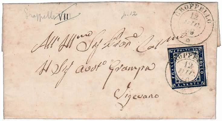 REGNO DI SARDEGNA ANNULLAMENTI - 1860, GROPPELLO doppio cerchio (p.R1) su 20 c. (15C) margini corti, lettera per Vigevano, 12/12/60 (data che anticipa quella riportata dal Sassone).(LETTERA)