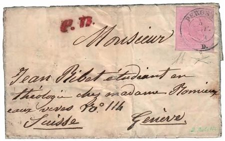 REGNO DI SARDEGNA ANNULLAMENTI - 1854, PEROSA (p.13) su 40 c.rosa (6a) della seconda emissione su lettera diretta a Ginevra il 5/11/54. Rarità. (Cert. A. Diena - Cert. Bottacchi).(LETTERA)