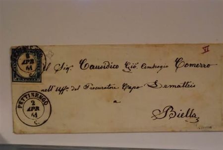 REGNO DI SARDEGNA ANNULLAMENTI - 1861, PETTINENGO (p.7) su 20 c. (15D) su bustina per Biella, 2/4/61. (E. Diena).(LETTERA)