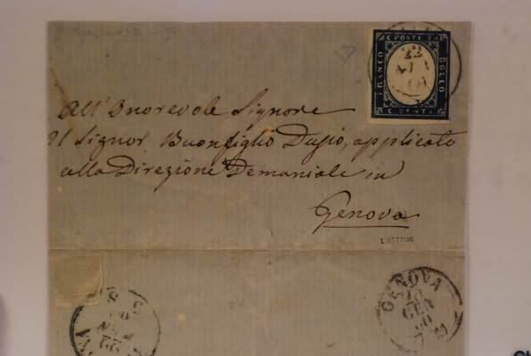 REGNO DI SARDEGNA ANNULLAMENTI - 1860, S. SEBASTIANO doppio cerchio (p.12) poco leggibile su 20 c. (15Bb) a filo a destra su lettera per Genova, non cpl. al retro, 22/01/60. (E. Diena).(LETTERA)