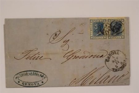 REGNO D'ITALIA - 1871, 20 c. azzurro (T26) coppia su lettera da Genova per Milano, 4/9/71, non annullato in partenza e timbrata in arrivo con il numero del portalettere "35" in ovale. Rara. (Fiecchi, E. Diena).(LETTERA)