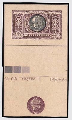 REGNO D'ITALIA - 1923, Saggi e Prove, Manzoni, 5 lire violetto e nero (156) prova di stampa realizzata su carta a macchina, paglierina non gommata. Ritocco a destra del contorno della foto. Al centro i colori di registro ed in basso la effigie centrale ti