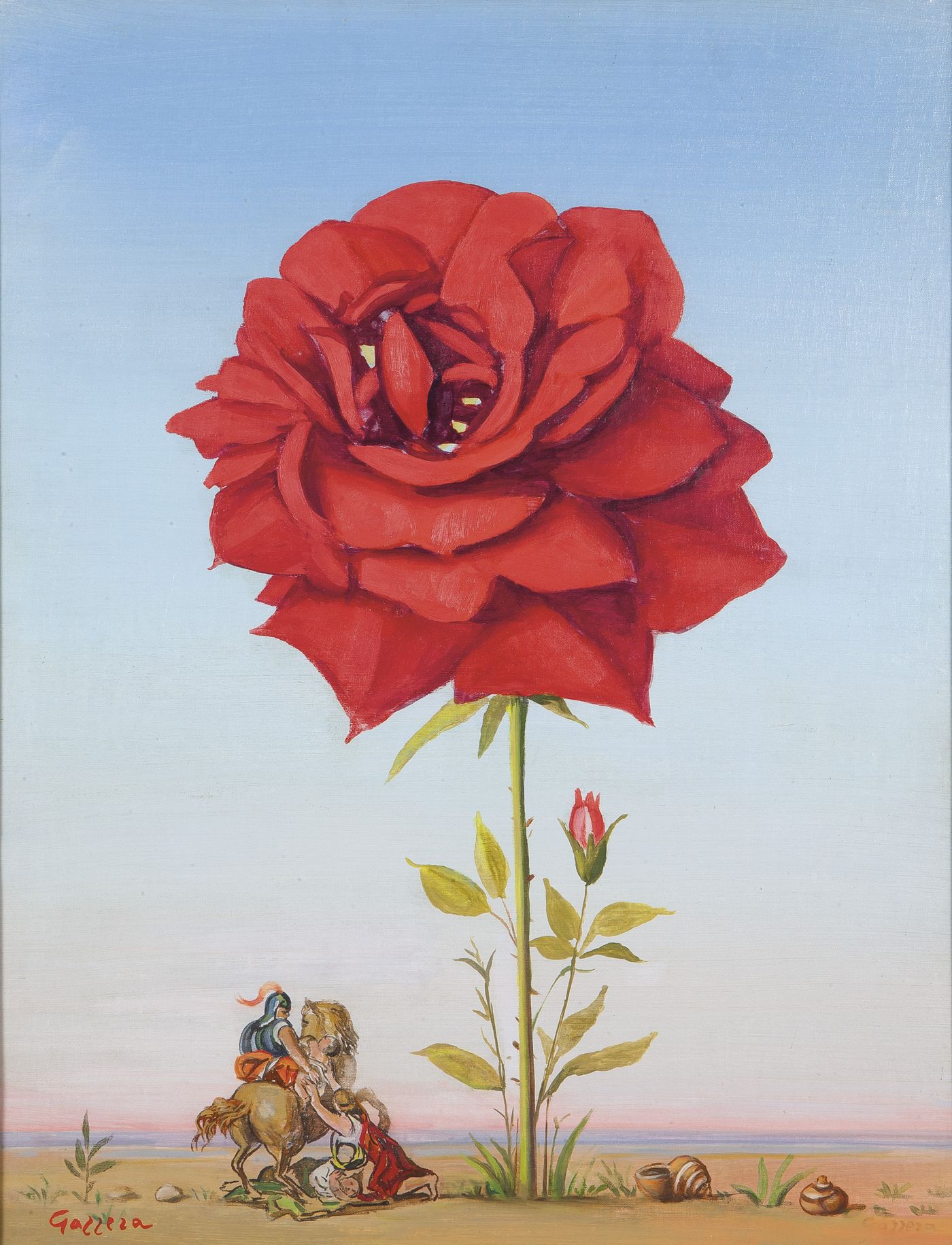 GAZZERA ROMANO (Ciriè (TO) 1908 – 1985) - "La rosa di Erode" 1965, 65x50 olio su tela. Opera firmata in basso a sinistra e al retro con data e titolo. Autentica della moglie Clara Gazzera su fotografia in data 7 ottobre 2011