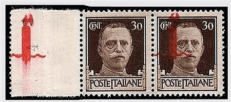 REPUBBLICA SOCIALE ITALIANA - 1944, 30 c. con soprastampa rossa di Firenze, coppia orizzontale di cui l'esemplare di sinistra senza soprastampa (492/IIn) e con il fascio sul bordo. (Cert.Terrachini).(GOMMA ORIGINALE)