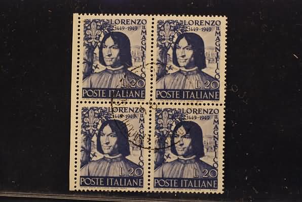 REPUBBLICA ITALIANA - 1949, Lorenzo il Magnifico (608) blocco di quattro.(USATO)