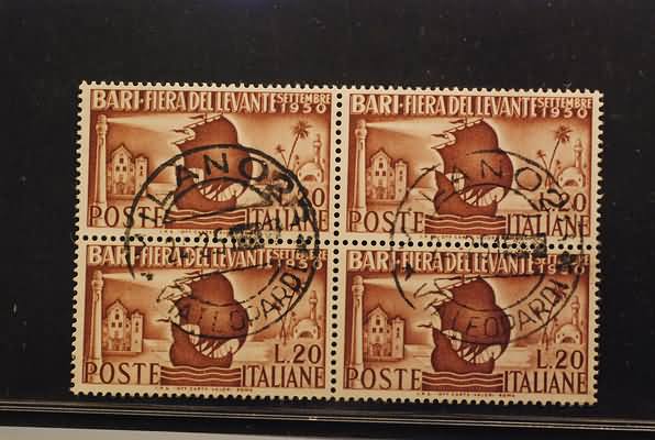 REPUBBLICA ITALIANA - 1950, Fiera del Levante, 20 lire bruno rosso (627) blocco di quattro.(USATO)