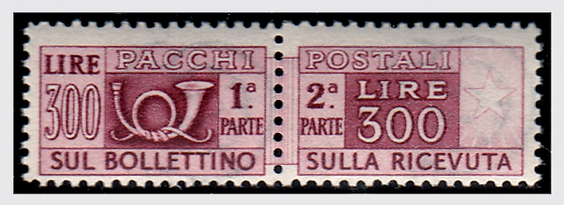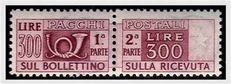 REPUBBLICA ITALIANA - 1948, Pacchi postali, 300 lire lilla bruno, fil. ruota (79).(GOMMA INTEGRA)