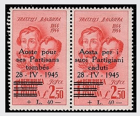 EMISSIONI LOCALI E C.L.N. - 1945, AOSTA, F.lli Bandiera 3 valori cpl. in coppie orizzontali con dicitura in italiano e in francese (CEI 1+4,2+5,3+6).(GOMMA INTEGRA)