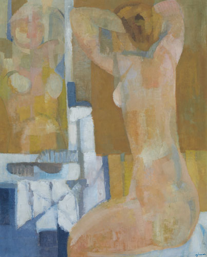 GIUSEPPE AJMONE Carpignano Sesia 17/02/1923 - 07/04/2005 Nudo allo specchio, anni '50 olio su tela cm. 100x81, firma in basso a destra, dichiarazione d'autenticità dell'artista datata 14/5/97 su foto