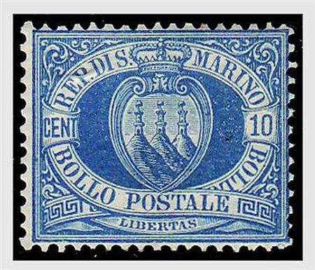 SAN MARINO - 1877, Stemma, 10 c.oltremare (3) fresco e di buona centratura....