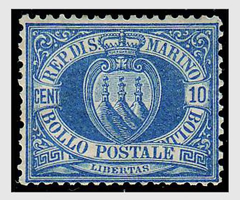 SAN MARINO - 1877, 10 c.oltremare (3) molto ben centrato. (Cert....