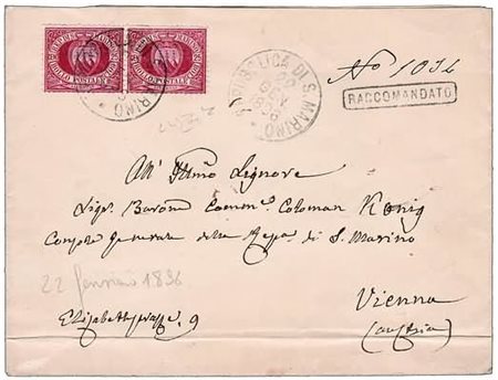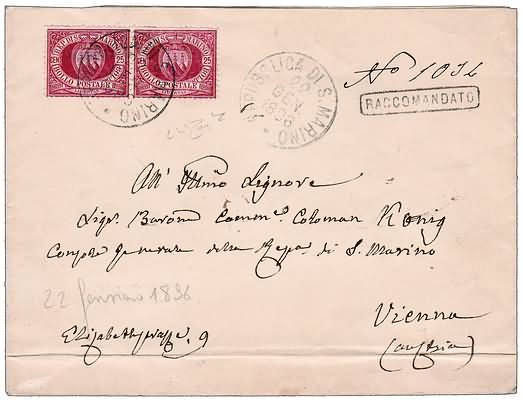 SAN MARINO - 1896, Stemma 25 c. lacca (5) coppia su raccomandata per Vienna, 22/1/96. (Raybaudi).(LETTERA)