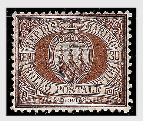SAN MARINO - 1877, 30 c. bruno (6) buona centratura. (Cert. Raybaudi).(GOMMA...
