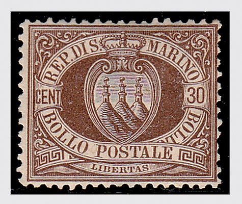 SAN MARINO - 1877, Stemma 30 c. bruno (6) discreta centratura. (Cert. R. Diena).(GOMMA ORIGINALE)