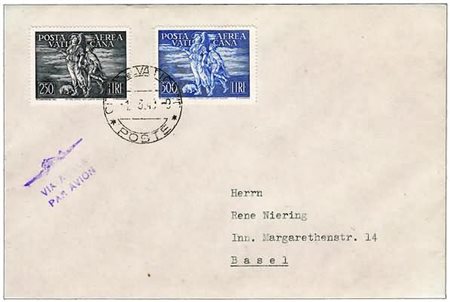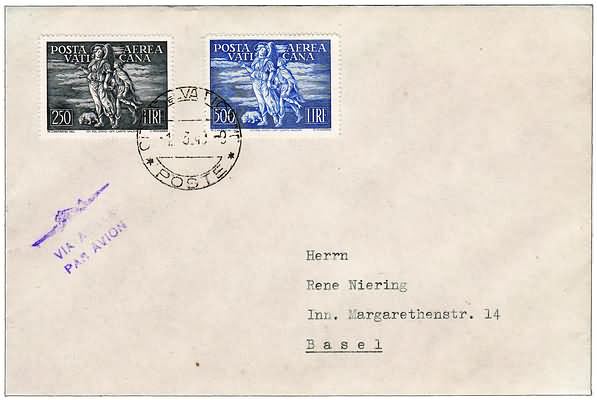 VATICANO - 1948, Posta aerea, Tobia 2 valori cpl. (16/17) su aerogramma per Basilea, 1/3/49, senza timbro d'arrivo.(LETTERA)