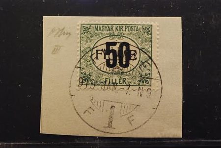 TERRE REDENTE - 1918, FIUME, Segnatasse 50 f. verde e nero con soprastampa a mano del III tipo (3/III).(FRAMMENTO)