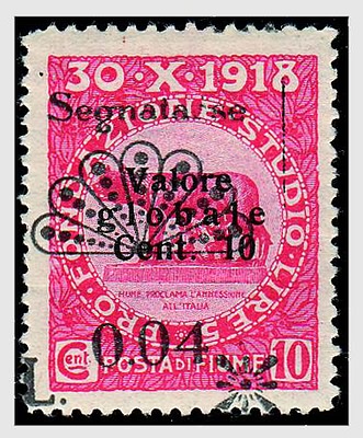 TERRE REDENTE - 1921, FIUME, Segnatasse, 0,04 su 10 c.carminio (26/I) "Valore globale" con caratteri modificati. Raro. (A. Diena - Cert. Raybaudi).(GOMMA INTEGRA)