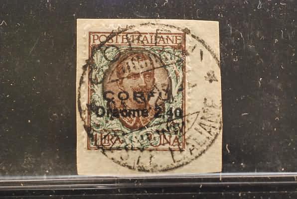 TERRE REDENTE - 1923, CORFU', 2,40 su 1 lira bruno e verde (11) su piccolo frammento(FRAMMENTO)
