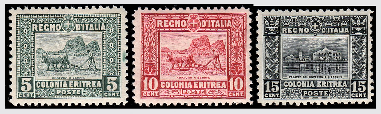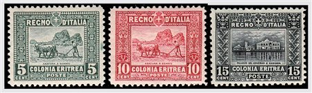 ERITREA - 1928-29, Soggetti africani dent. 11 3 valori cpl. (129/31) ben...