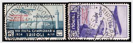 TRIPOLITANIA - 1934, Posta aerea, Circuito delle Oasi (34/40). (Cert. B.S. Oliva per i 2 alti valori. Cert. Sorani per il 25 lire).(USATO)
