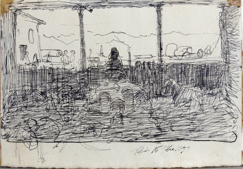 VOLPEDO PELLIZZA "Portico con pecore in controluce" 1893 china su carta Firma...