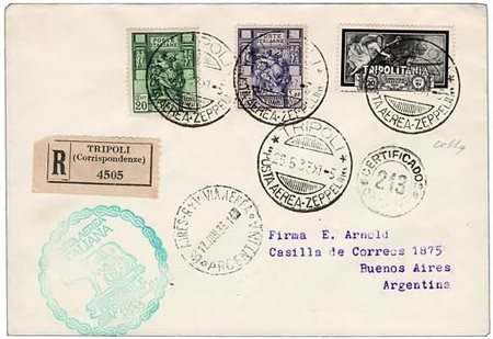 POSTA AEREA - 1933, TRIPOLITANIA, Zeppelin, aerogramma da Tripoli per B. aires affrancato con 20 lire (A.27) + 2 complementari di Libia (Colla).(LETTERA)