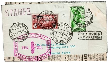 POSTA AEREA - 1934, TRIPOLITANIA, volo Roma-B. Aires, volo interrotto (27/29 gennaio), giornale sottofascia affrancato con 2 lire di p. aerea (30) + 25 c. Decennale di Emissioni generali (33) (Longhi 34RLm variante). Molto raro e bello. (E. Diena, Zanetti