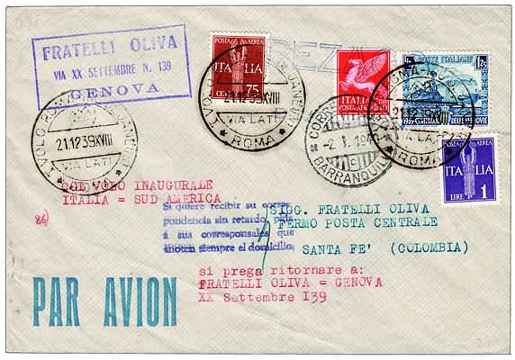 POSTA AEREA - 1939, ITALIA, I Volo L.A.T.I. Roma - Santa Fé (Colombia),...