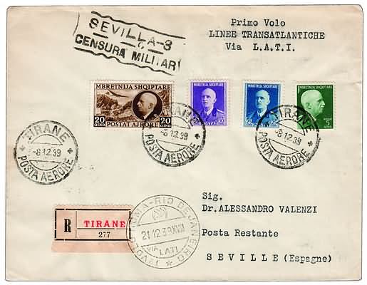 POSTA AEREA - 1939, ALBANIA, I Volo L.A.T.I. Roma - Siviglia corriere da...