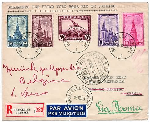 POSTA AEREA - 1939, BELGIO, I Volo L.A.T.I. Roma - Rio de Janeiro, corriere...