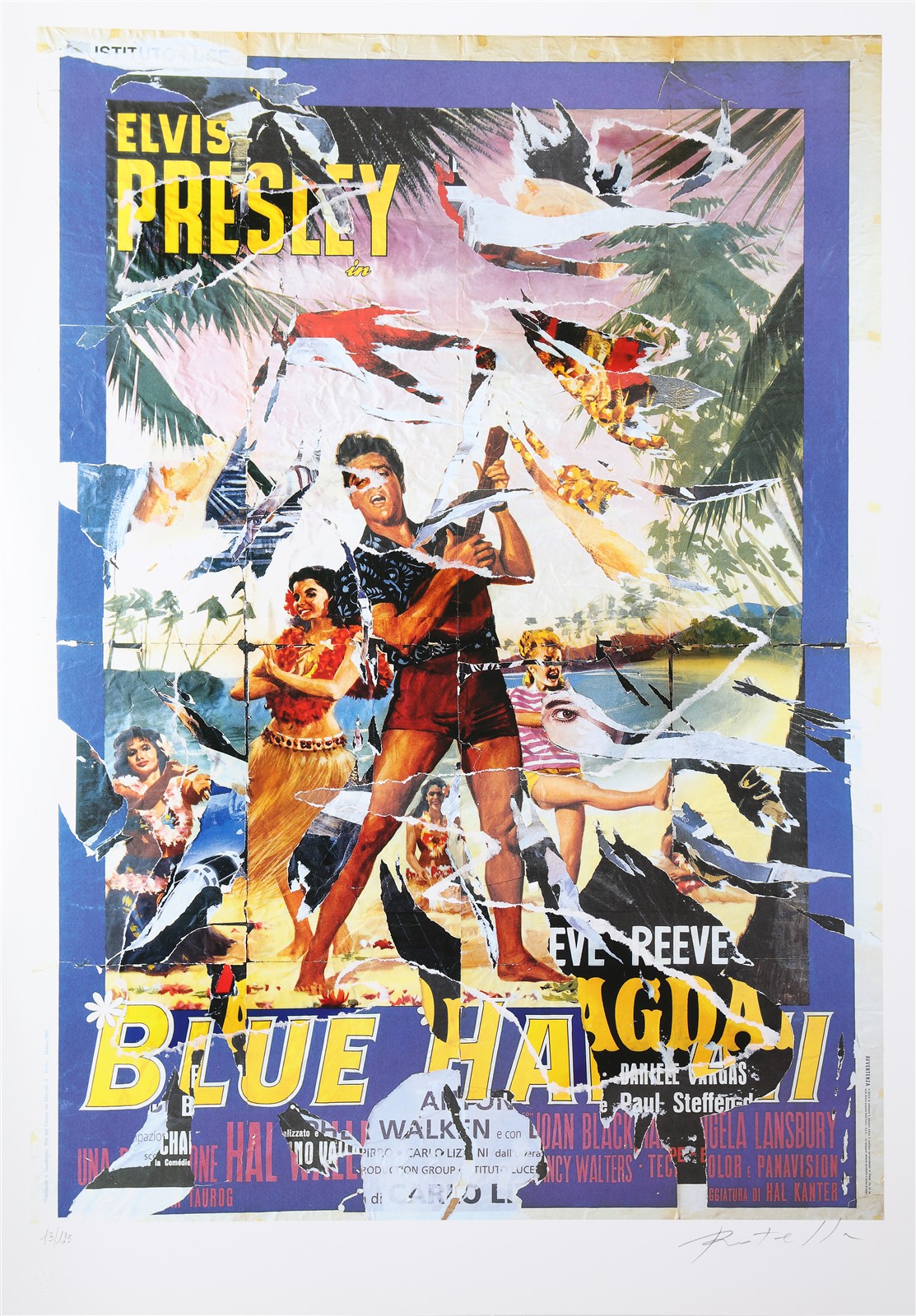 ROTELLA MIMMO (1918 - 2006) Blue Hawaii. Litodecollage. Cm 70,00 x 100,00. 13/125. Tiratura e firma a matita in basso. Timbro a secco Fondazione Mimmo Rotella, Milano in basso a sinistra. Pubblicazione: Mimmo Rotella - Multiples décollages, Silvana Editoriale, 2005, pag. 33.