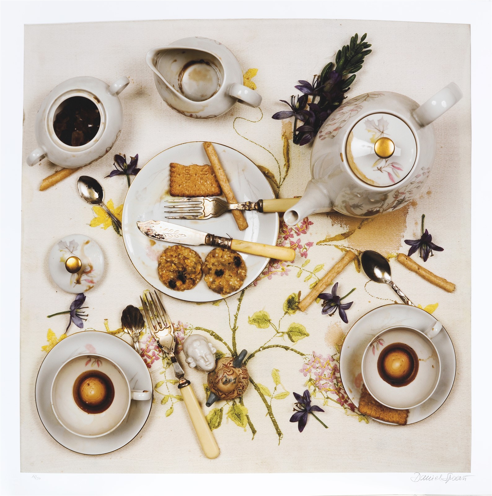SPOERRI DANIEL (n. 1930) 5 O'Clock Tea. Litografia. Cm 60,00 x 60,00. 17/50. Tiratura e firma a matita in basso. Timbro a secco a cura di Gallerie Edition.