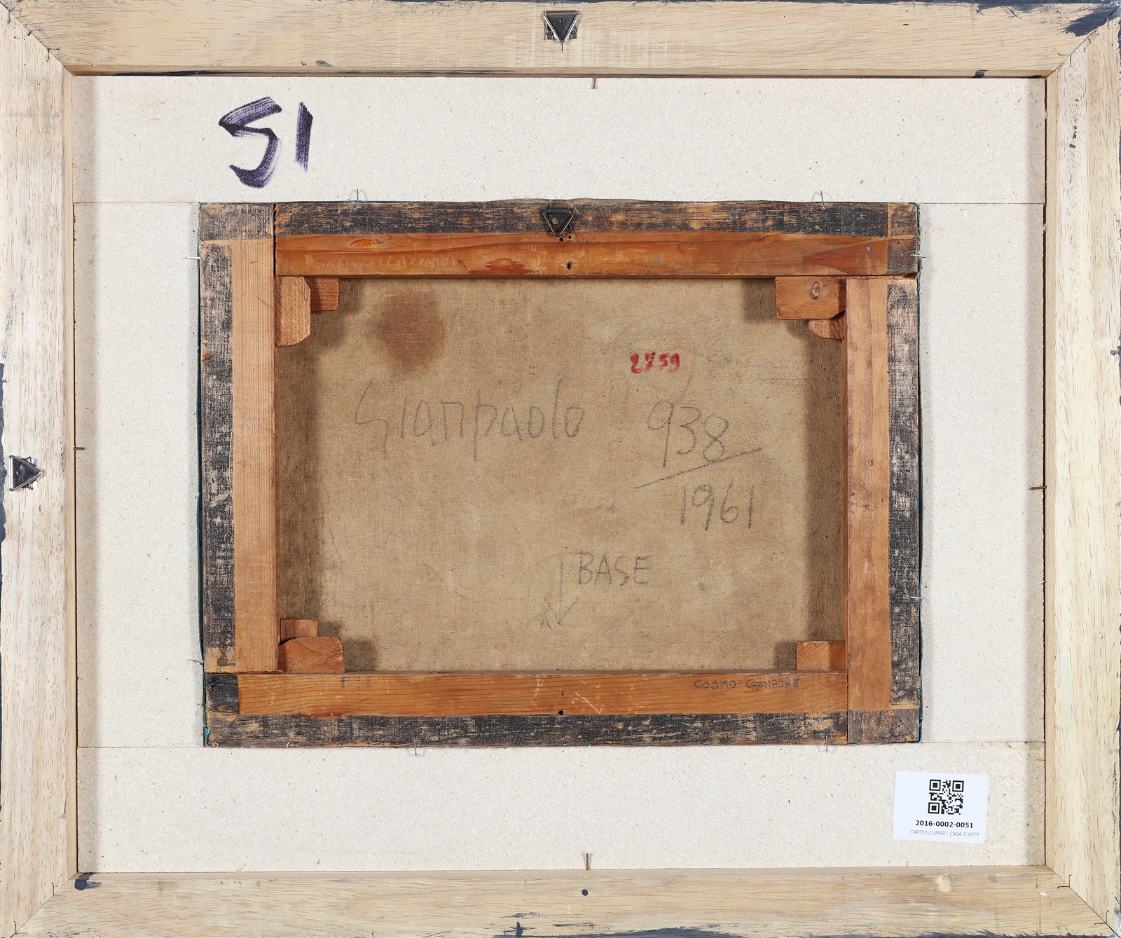 GIAMPAOLO (XX SEC.) Senza titolo. 1961. Tecnica mista su tela. Cm 40,00 x 30,50. Firma in basso al centro. Al retro firma e anno. Cornice presente