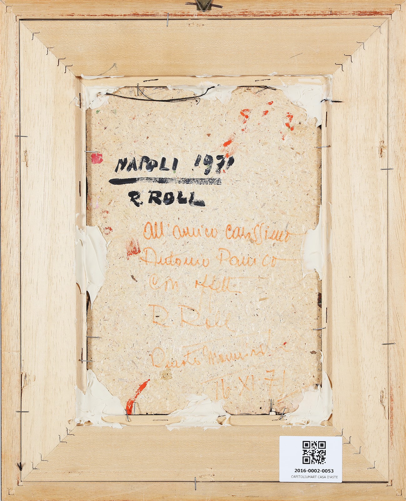 ROLL RONALD Senza titolo. 1971. Tecnica mista su tavola. Cm 20,00 x 30,00. Firma e anno in basso a destra. Al retro firma, anno e dedica. Cornice presente