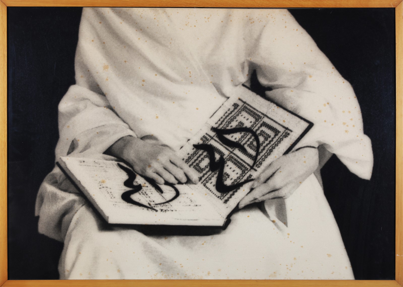 GUERRESI PATRIZIA (n. 1951) Fathima con libro. 2002. Foto aerografata su carton legno. Cm 100,00 x 70,00. Al retro titolo, firma e anno. Cornice presente