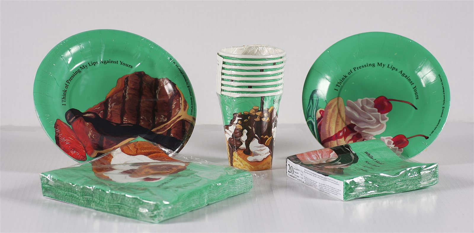 JACQUETTE JULIA (n. 1964) Projects 69. Serigrafia. . Lotto composto da 5 confezioni contenenti bicchieri, piatti e tovagliolini di carta stampati con motivi tipici della iconografia dell'artista. Le opere sono state create in serie non numerate per la mostra Julia Jaquette, Projects 69 e rese disponibili presso il MoMA's Café/Etc. dal 22 Novembre 1999 al 1 Gennaio 2001 in modo che i visitatori potessero utilizzarle per servirsi da mangiare e da bere.