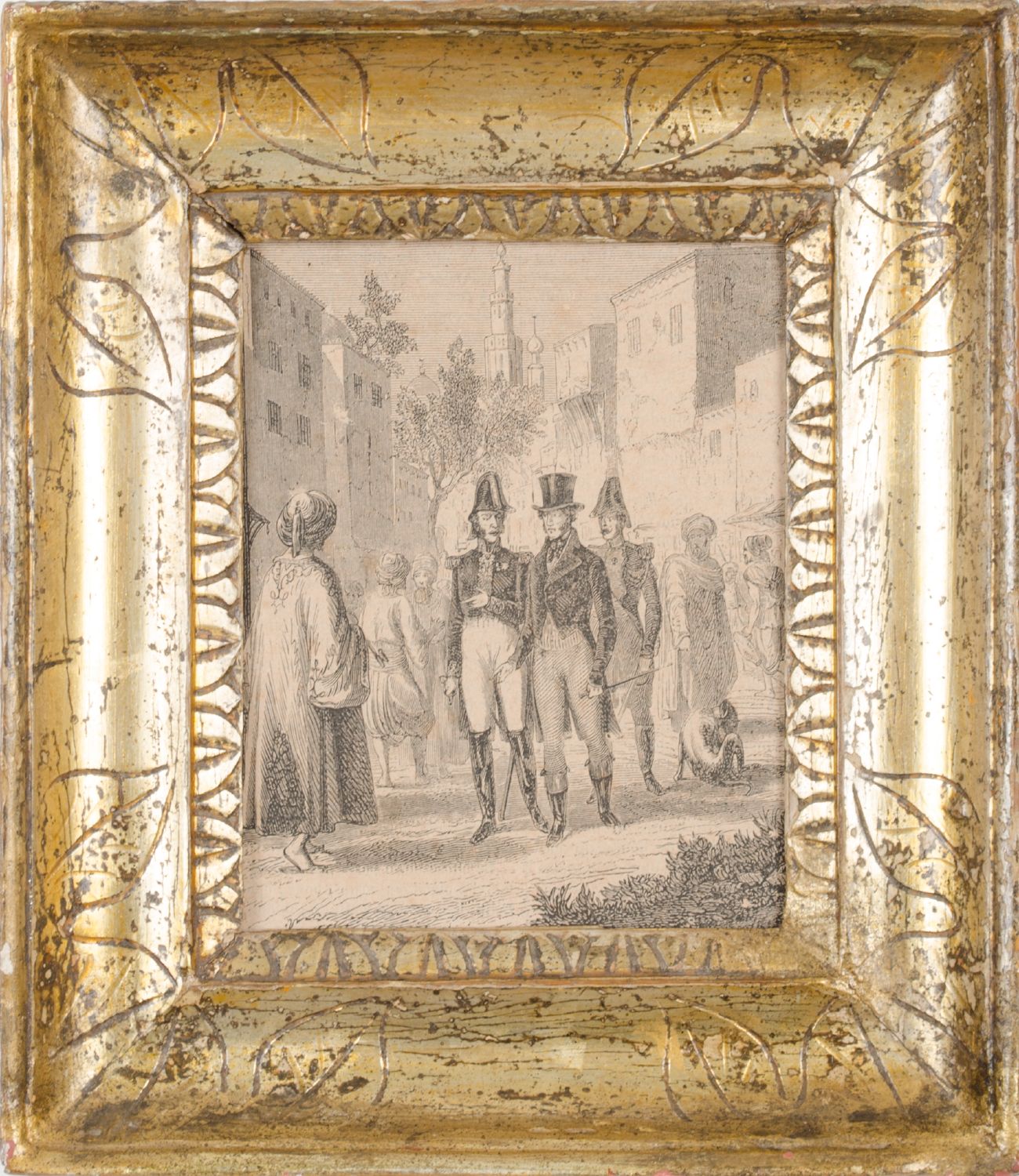 CORNICETTA a canna ciaccata in legno forato ad argento a mecca contenente stampa raffigurante "militari" (cm 13,5 x 16). Sicilia XIX secolo Misure: cm 18,5 x 21