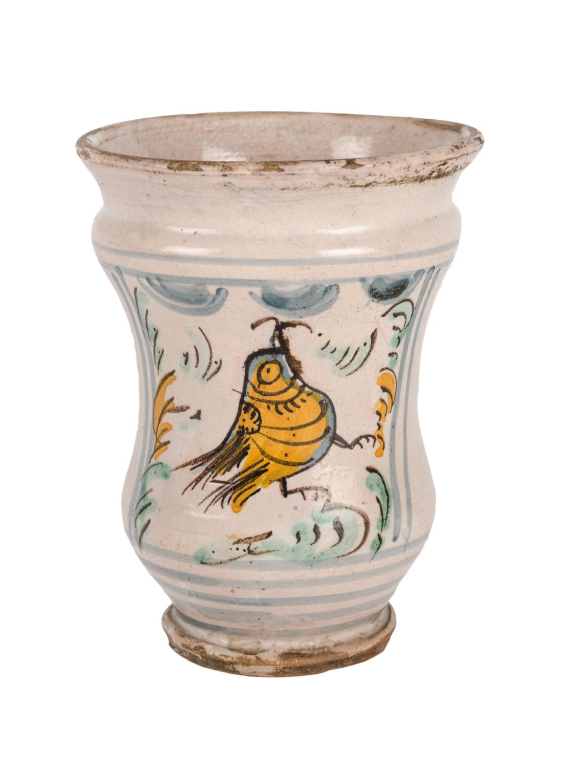 PICCOLO VASO da farmacia in ceramica smaltata e decorata a mano raffiurante "volatili". Napoli primi '800 Misure: h cm 15,5