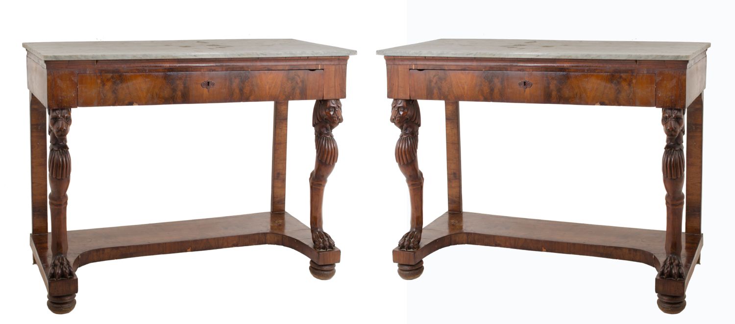 COPPIA CONSOLES Impero in mogano e piuma di mogano con cassetto centrale, piedi e teste leonine e piano in marmo bianco di Carrara venato. Sicilia I meta' '800 Misure: cm 129 x 56 x h 98