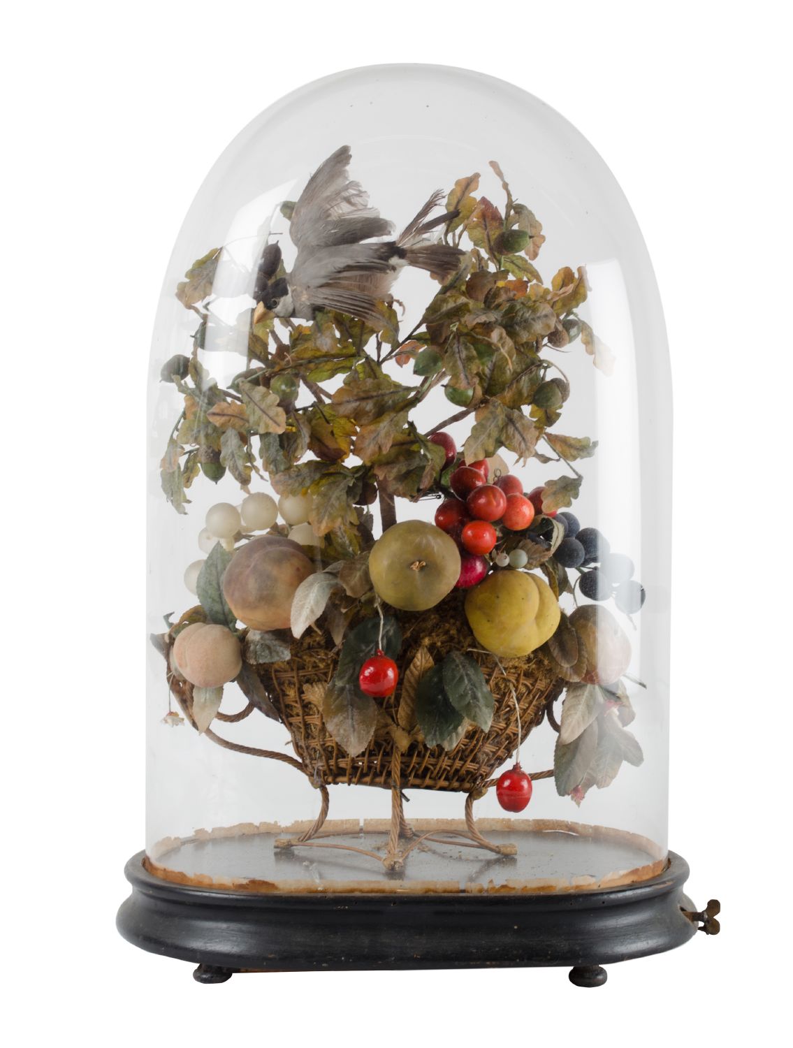 COMPOSIZIONE di frutta in cera con volatile e carillon (da revisionare) entro campana in vero. Sicilia XIX secolo Misure: h cm 50