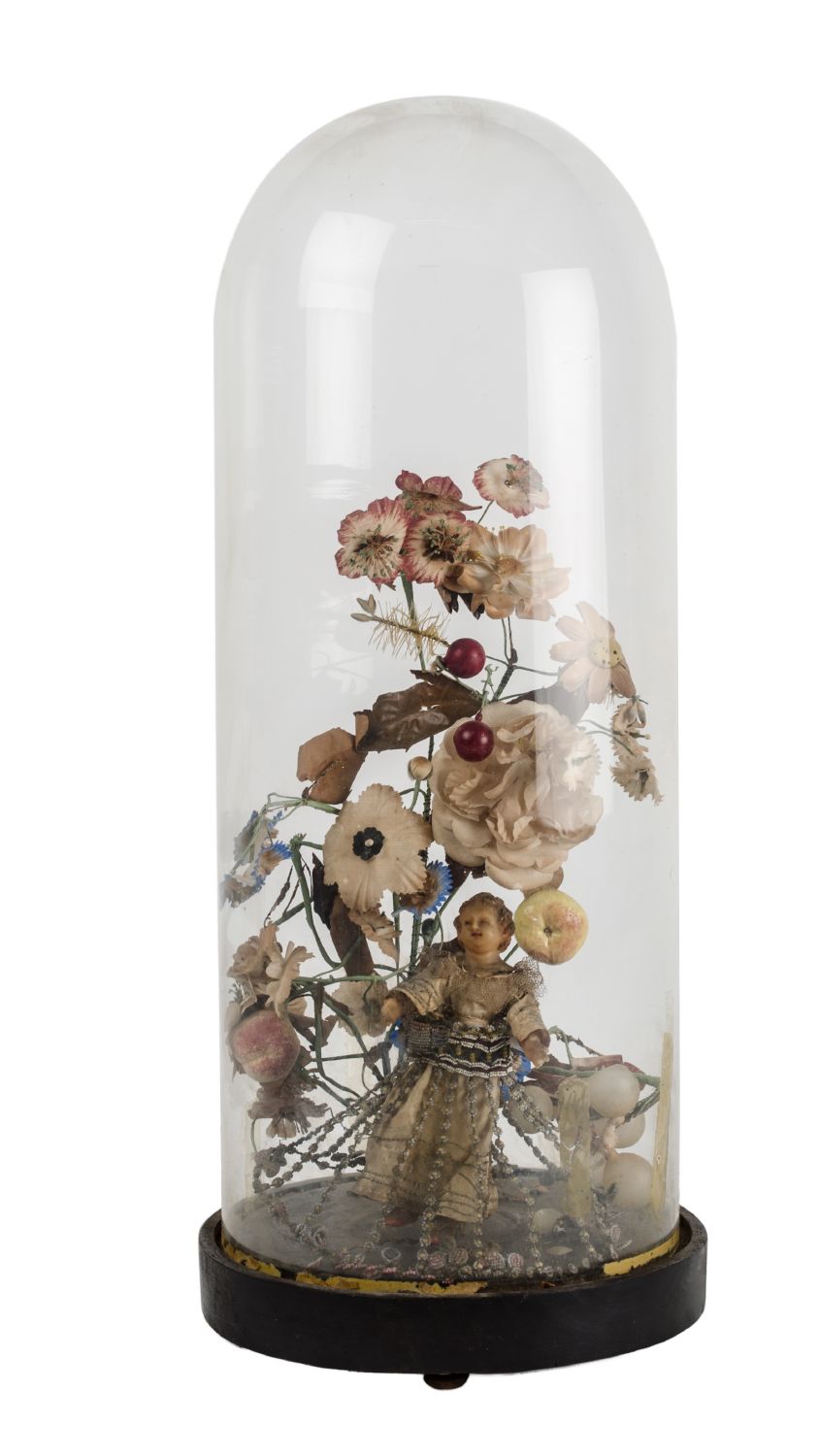 COMPOSIZIONE in cera raffigurante "figura sacra con fiori" entro campana in vetro. Sicilia primi '800 Misure: h cm 49