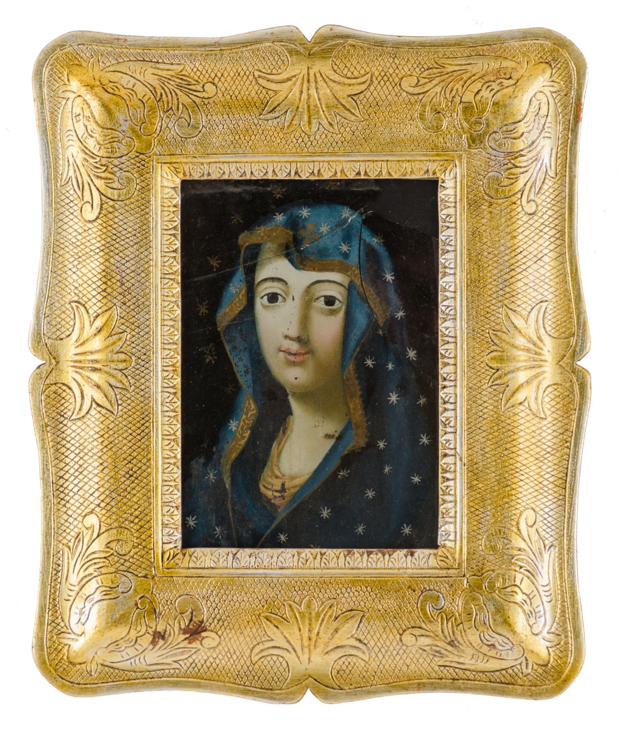 PITTURA su vetro "Madonna" entro cornice a guantiera non coeva (mancanze e rotture). Sicilia XIX secolo Misure: cm 21 x 28