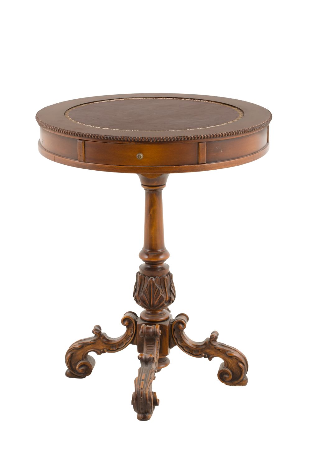 TAVOLINO circolare in noce con due cassettini, piano in ecopelle, fusto e piedi intagliati (usure). Italia XX secolo Misure: diametro cm 56 x h 70