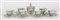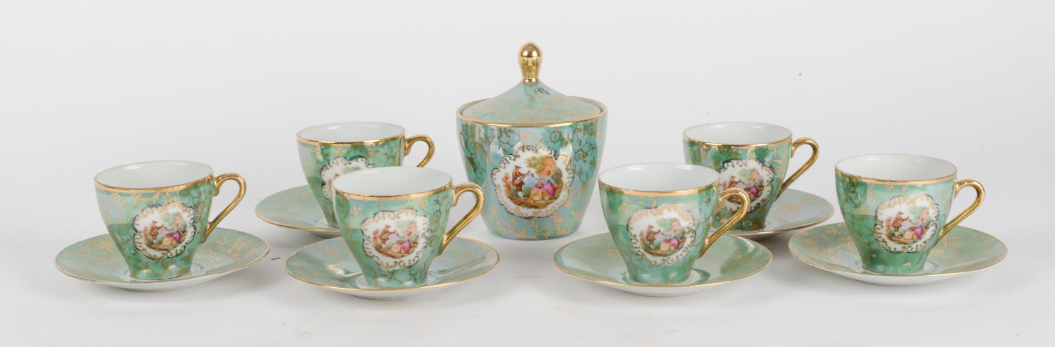 SERVIZIO da caffe' in porcellana Bavaria decorata nei toni del verde con medaglioni raffiguranti "scene galanti", perfili in oro. XX secolo Misure: varie