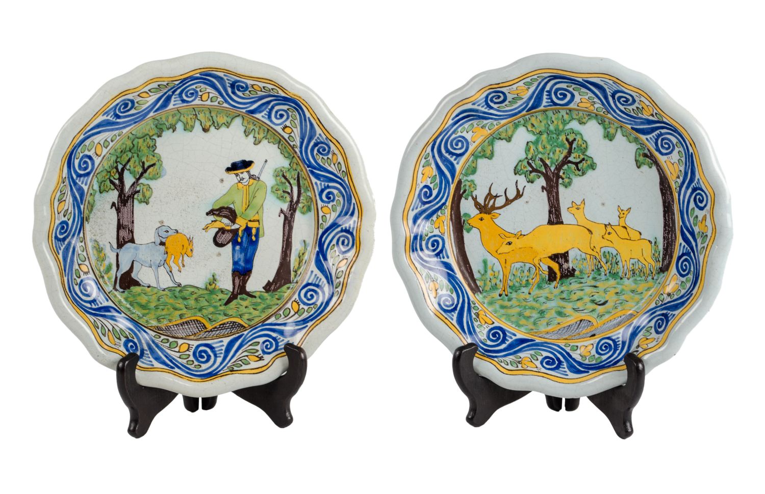 COPPIA PIATTI in ceramica smaltata e decorata raffigurante "scene di caccia"....